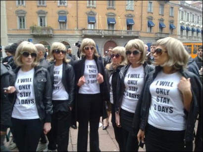 Para protestar contra isso, um grupo de jovens caracterizadas com peruca loira e de franja, óculos escuros e uma blusa com a frase de Anna: “Eu vou ficar apenas três dias” circularam na porta do local de desfiles de Milão, uma hora antes de começar o desfile da Gucci. BAFÃO!