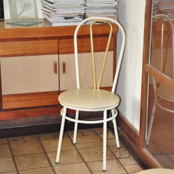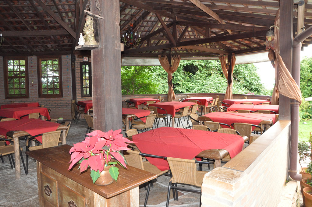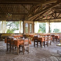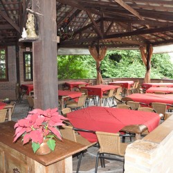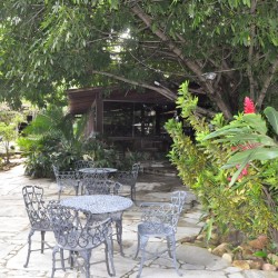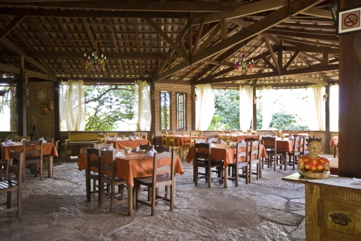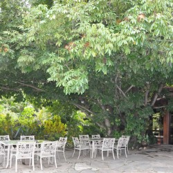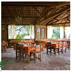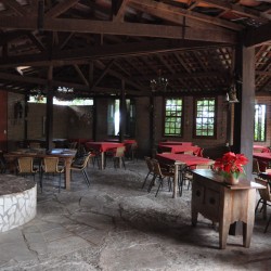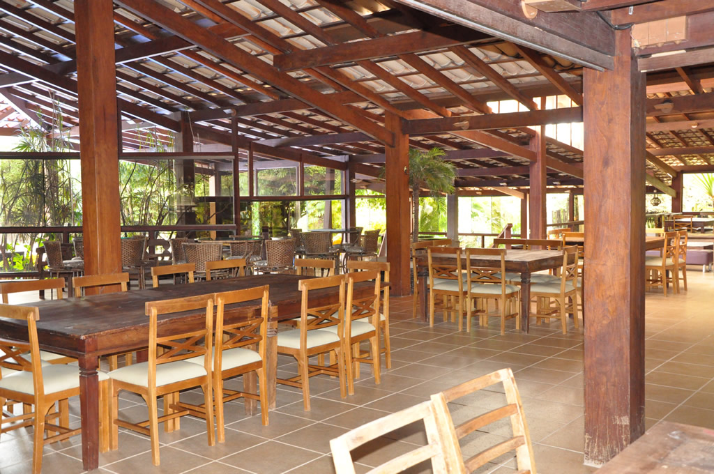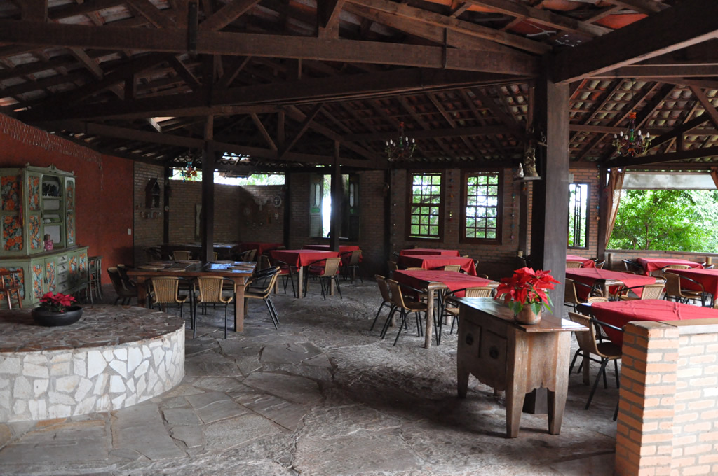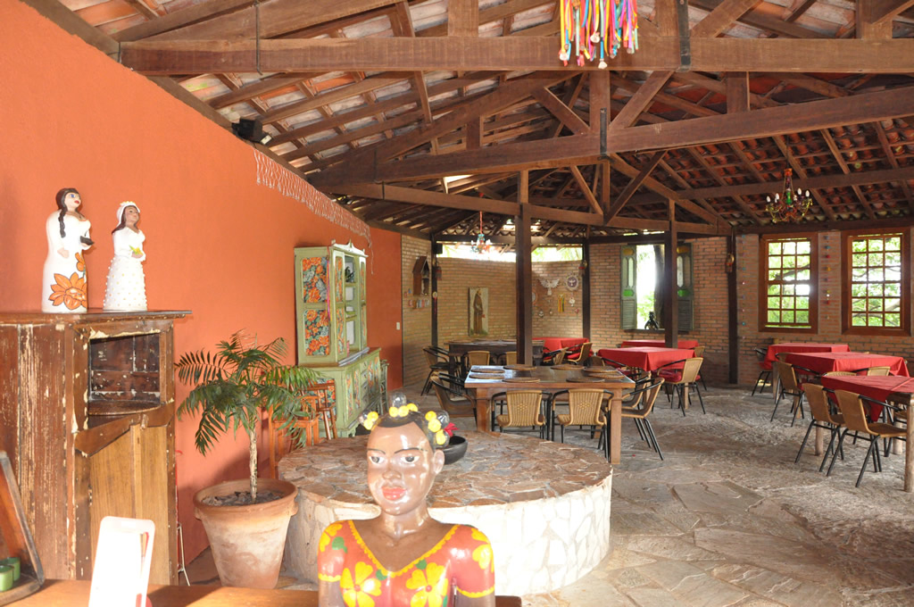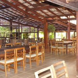 - Mobiliário: Mesas e cadeiras de madeira meio rústicas.