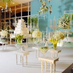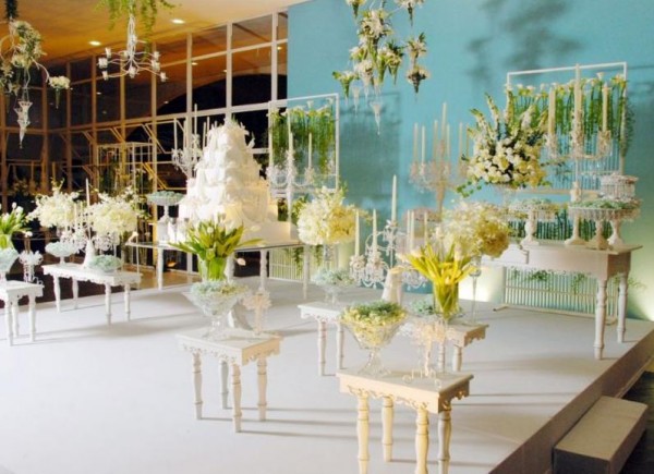 - Mobiliário: Mesas e cadeiras para a recepção e cadeiras brancas para a cerimônia.