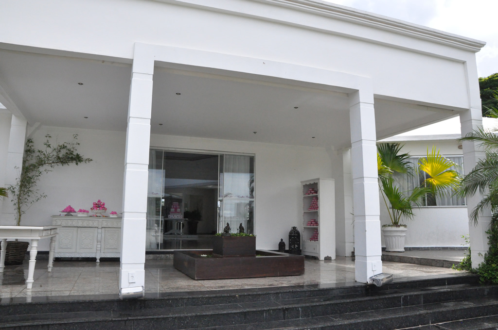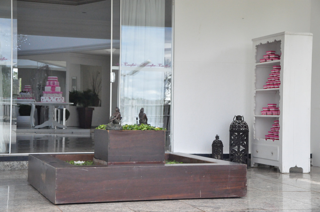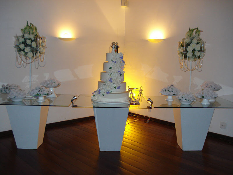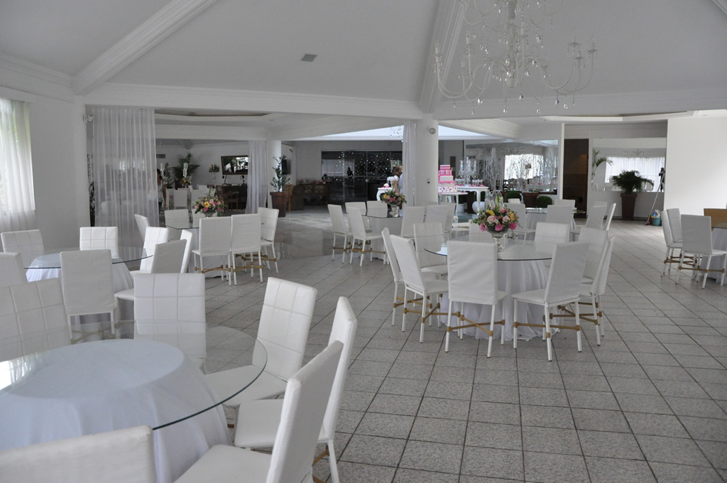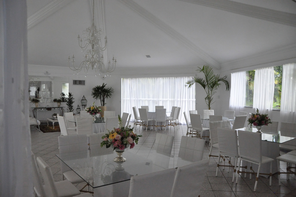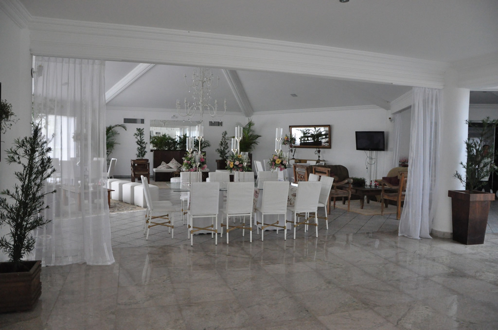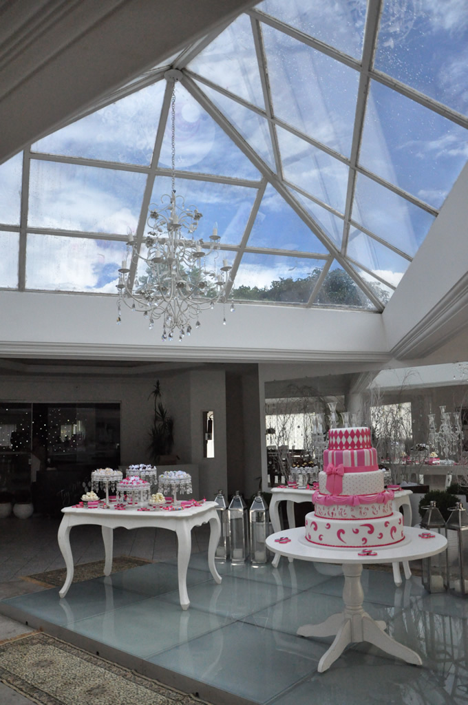 Recepção coberta: Toda branquinha, linda! Com uma clarabóia no local onde pode ser colocada a mesa do bolo.