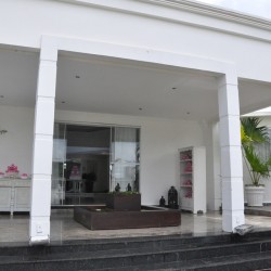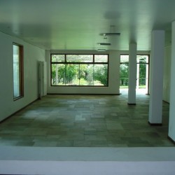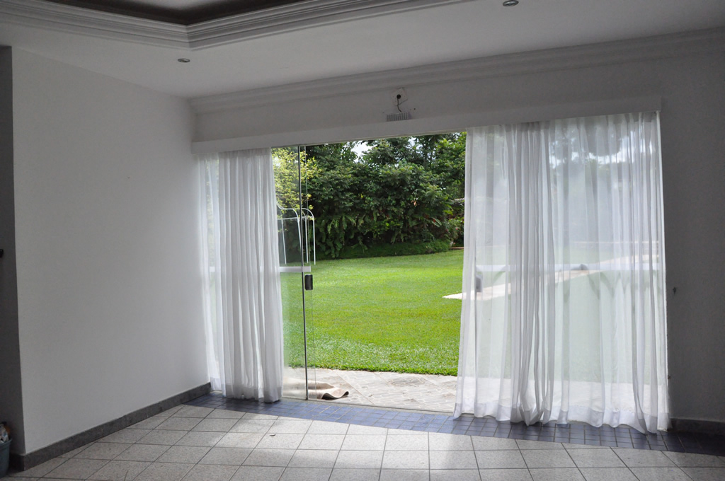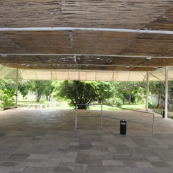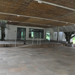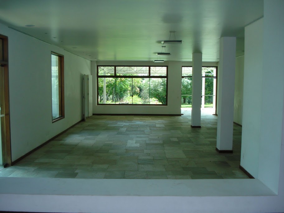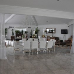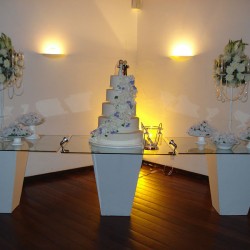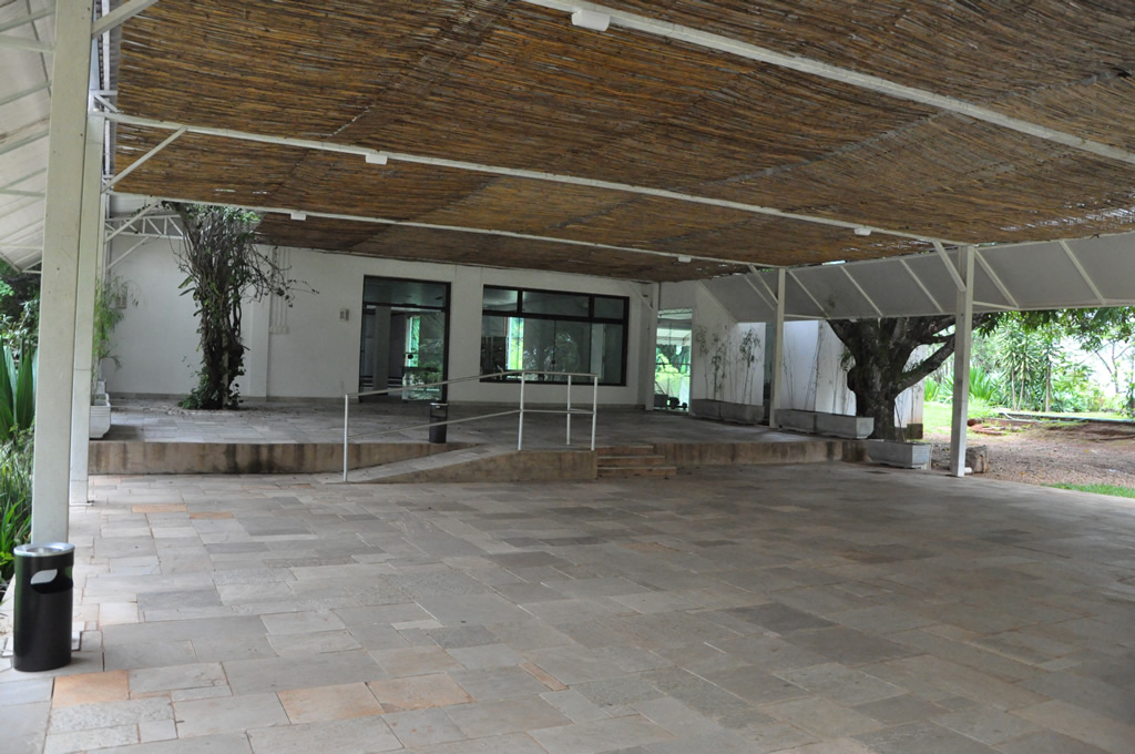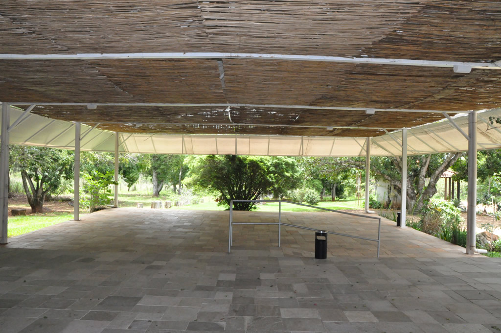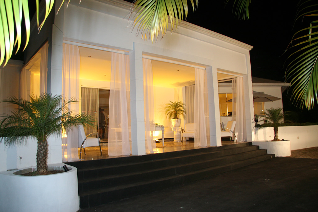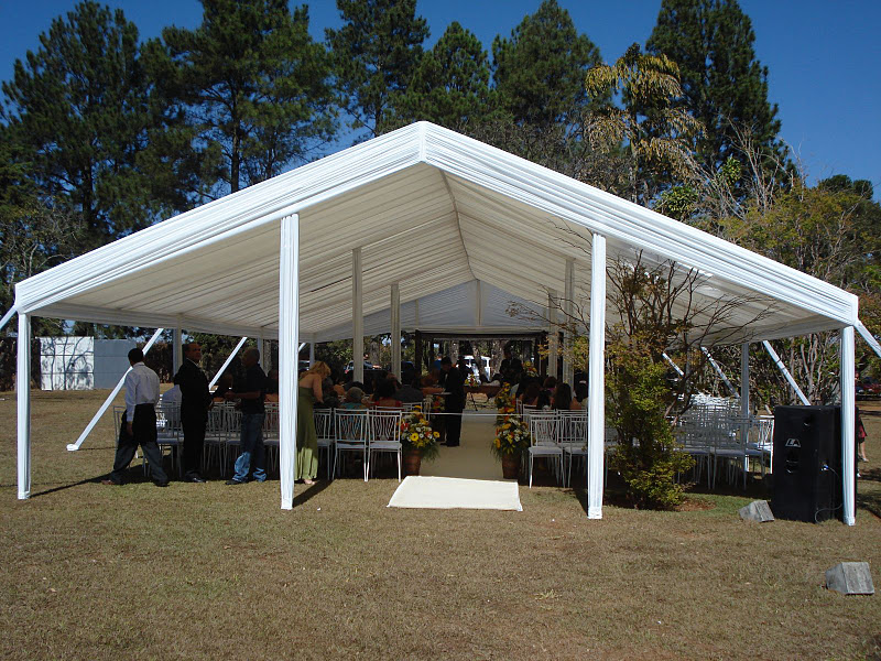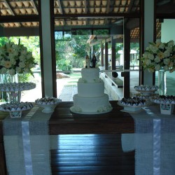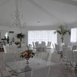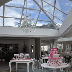 Recepção coberta: Toda branquinha, linda! Com uma clarabóia no local onde pode ser colocada a mesa do bolo.