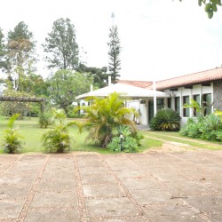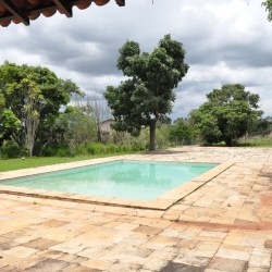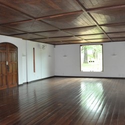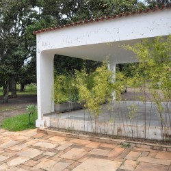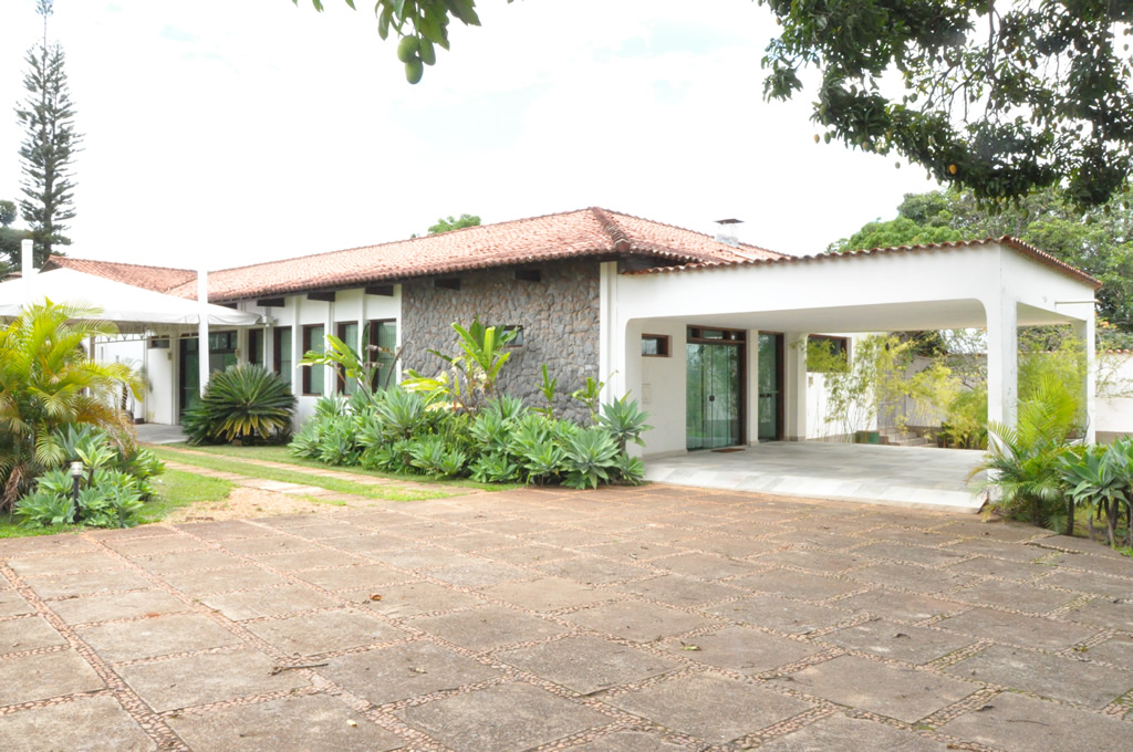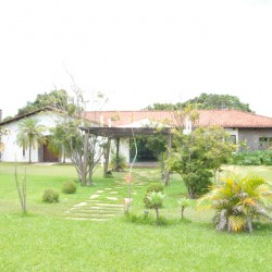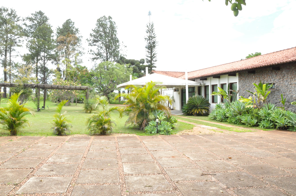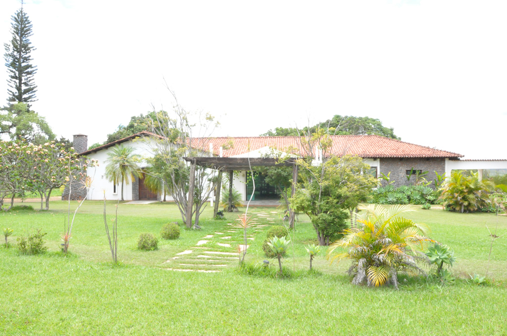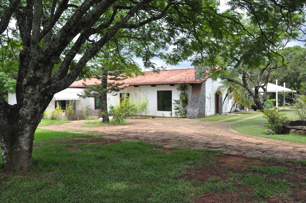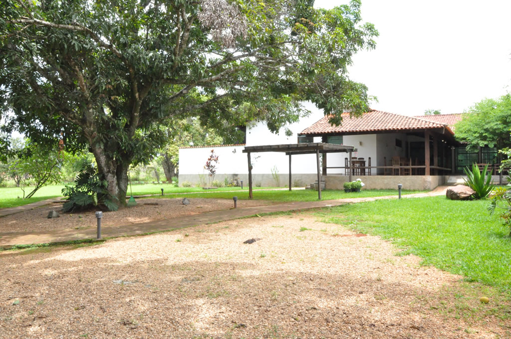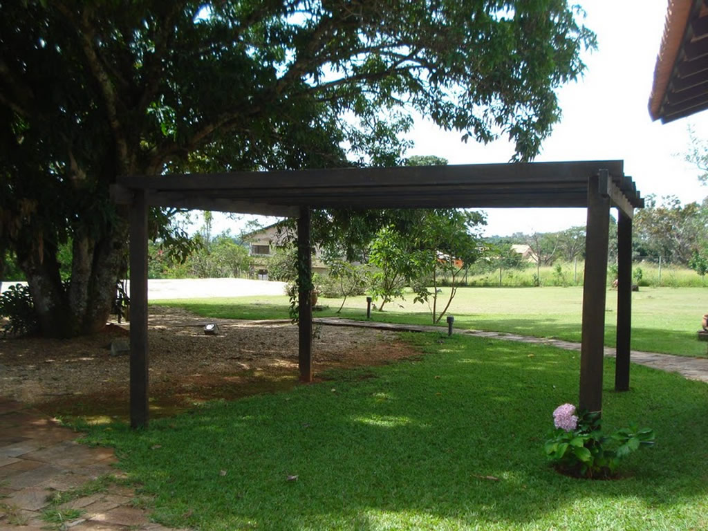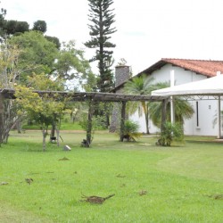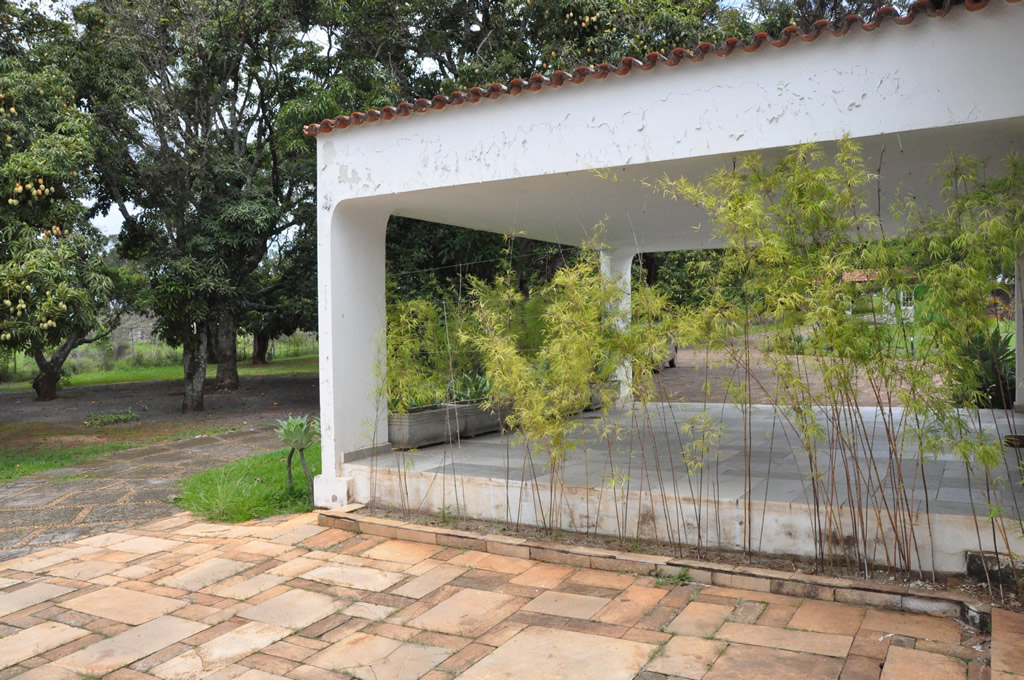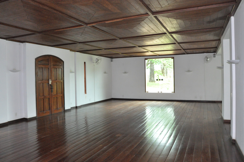 Recepção coberta: Casa com aspecto de fazenda, piso em madeira