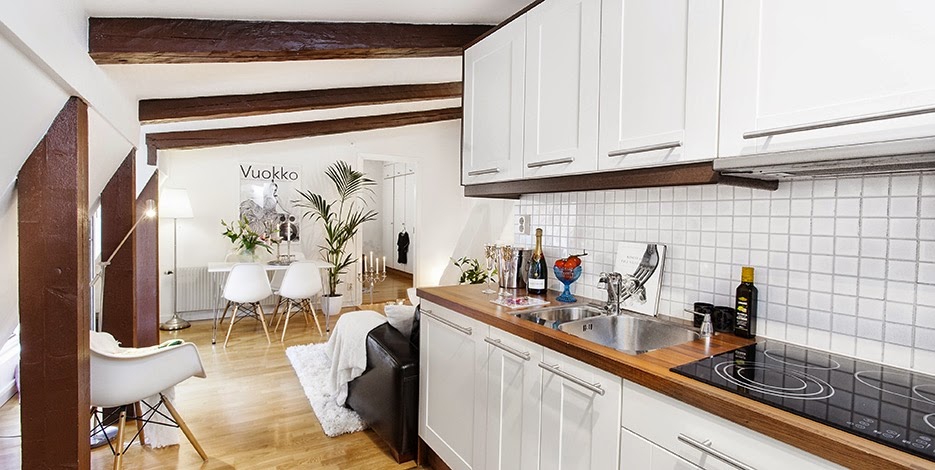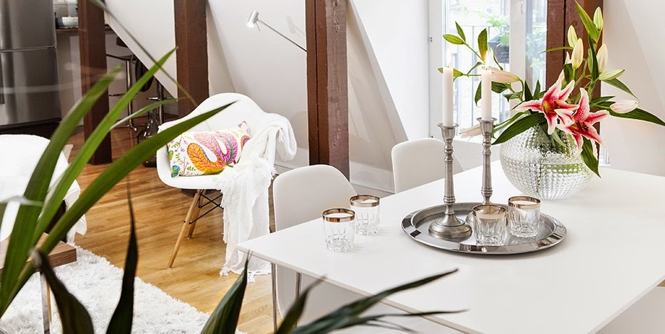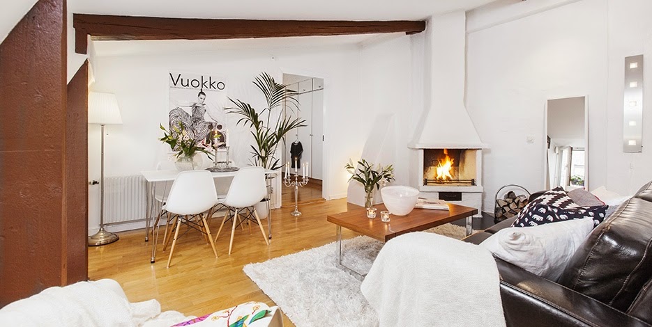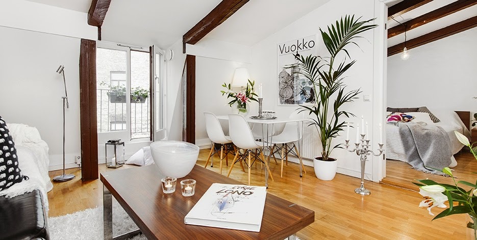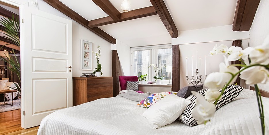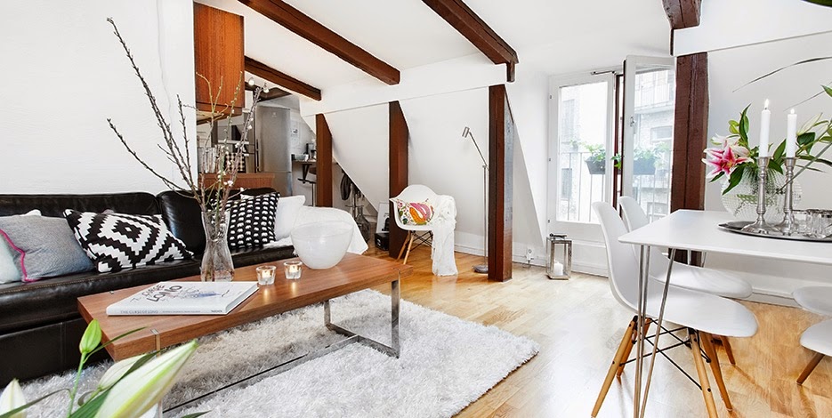 Embora tenha apenas 2 quartos, este loft em Estocolmo (Suécia) tem uma boa distribuição dos espaços, que faz com que pareçam mais espaçosos e muito confortáveis. As vigas de madeira aparente trazem um ar de casa para o apartamento. Apaixonada por essas almofadas com estampas gráficas. E esse vaso de plantas? É pra...