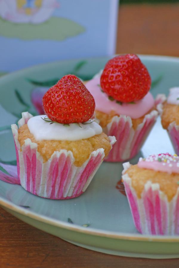 Morangos de mentirinha sobre cupcakes