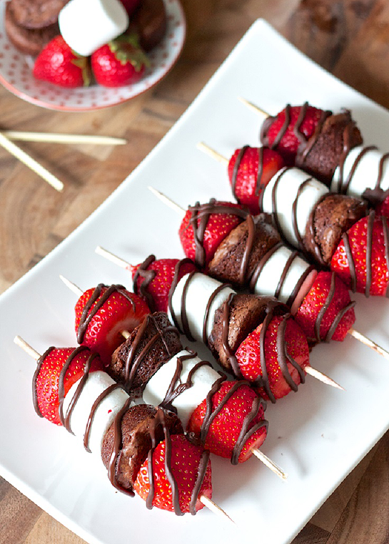 Espetinhos de morango, marshmallow e bolo de chocolate