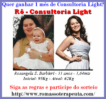 A gatíssima Rosângela Barbieri está sorteando 1 mês de consultoria light grátis. Quem quiser saber como concorrer, basta clicar na imagem abaixo ou no selinho aqui na barra lateral.